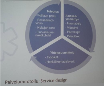 Ohessa on kuvia luennolta Service Design Meetup Tampereella 10.5. Siinä Noona Taavela, Tampereen yliopistollisen keskussairaalan palvelumuotoilija, kertoo eräästä projektista. Hän oli ollut muotoilemassa dialyysipotilaille uutta hoitomahdollisuutta. Aiemmin oli ollut kaksi vaihtoehtoa: 1) yleisin, jossa hoitaja kutsuu potilaat hoitoon, kun sairaalalle sopii ja tekee hoidon tai 2) potilas ottaa hoitolaitteen kotiin ja tekee hoidon omatoimisesti. Nyt suunniteltiin kolmas vaihtoehto, jossa sairaalassa on yhdessä huoneessa v